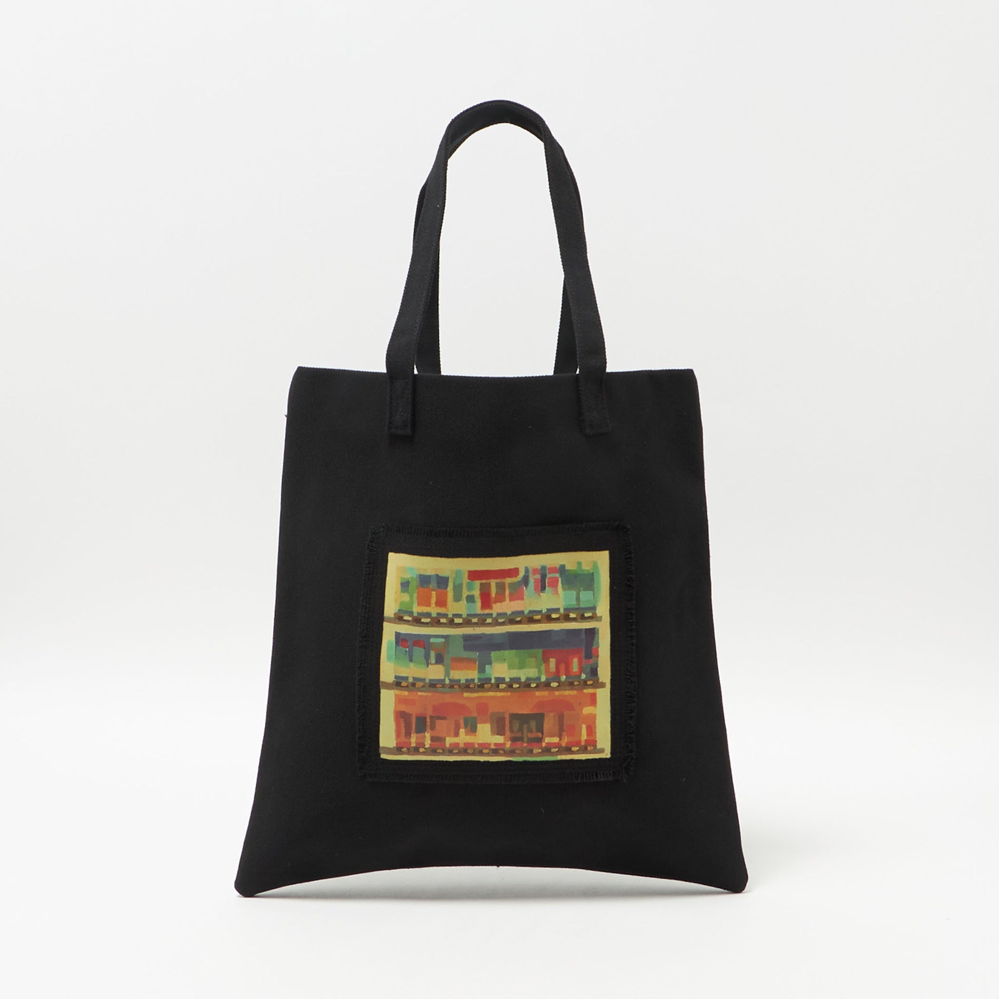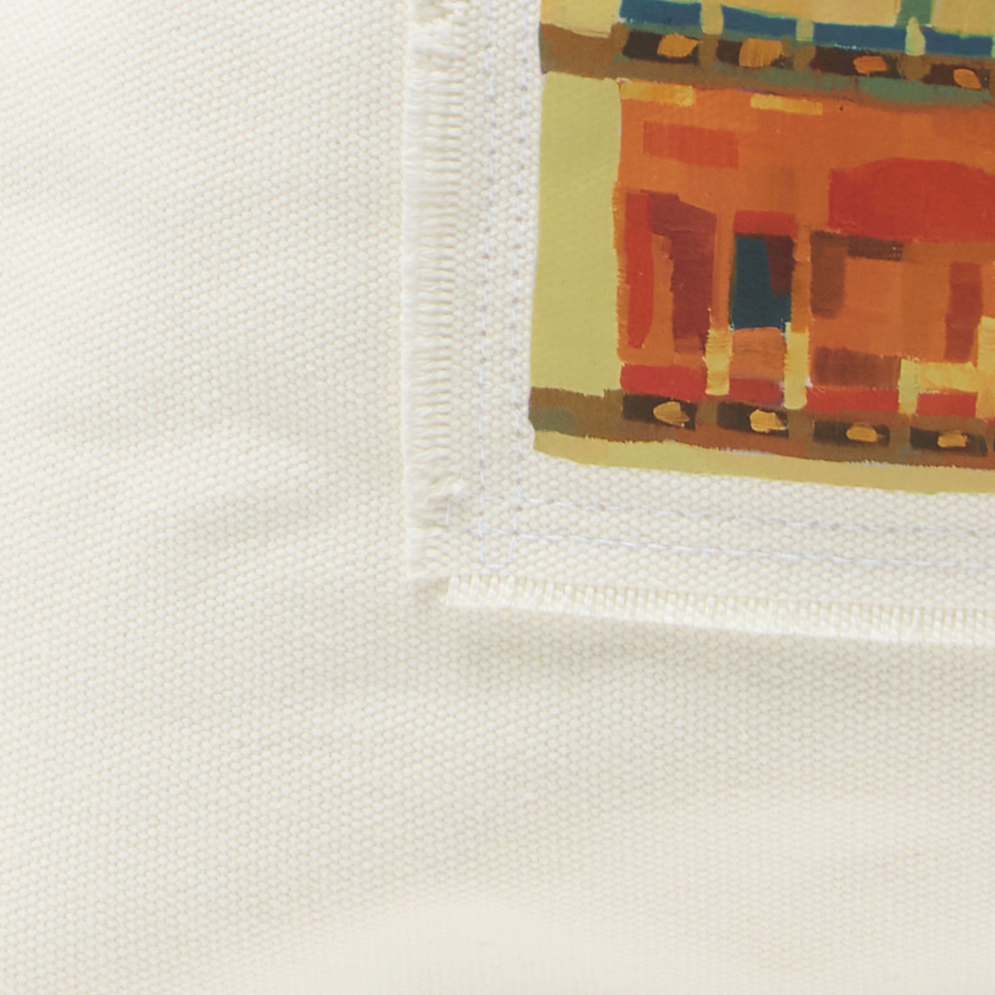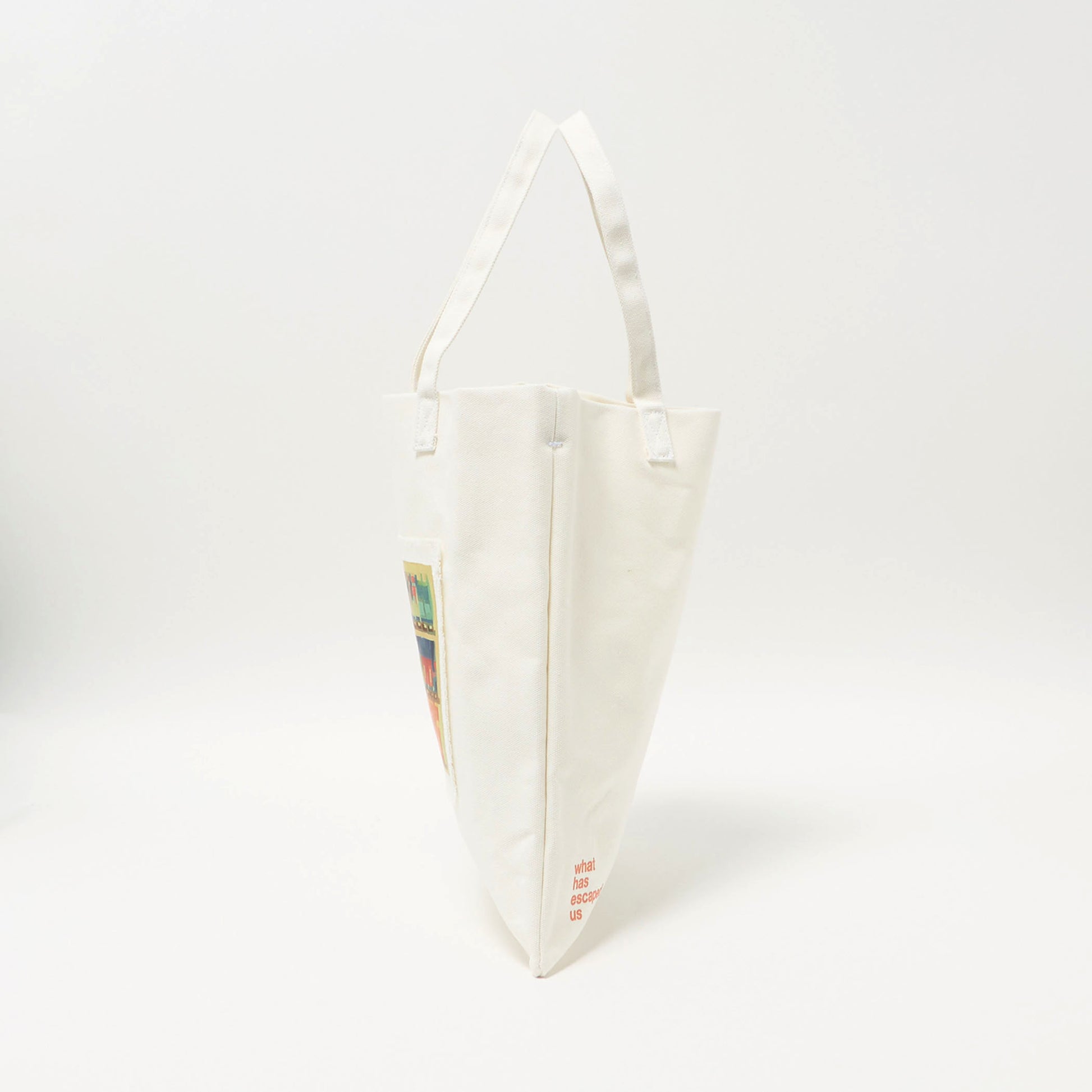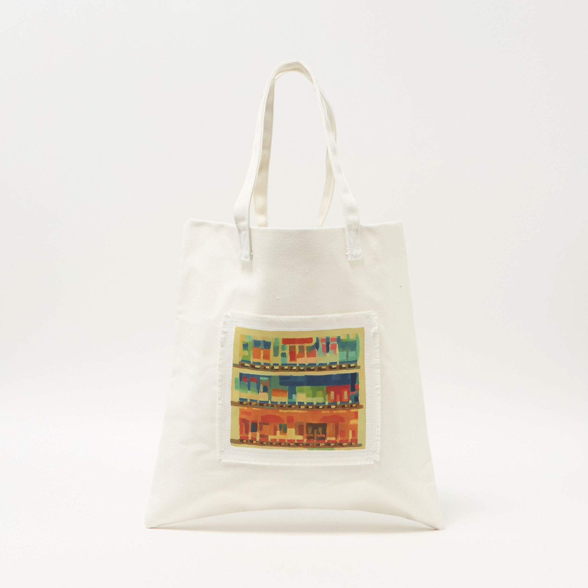 A tote bag featuring the vending machine motif frequently seen in Morimoto’s work. The artwork’s intentionally blurred contours and soft color palette evoke a sense of quiet nostalgia. Reflecting a meticulous attention to detail, the design is first printed onto a separate piece of the same fabric, which is then sewn onto the bag rather than printed directly. These fabric edges are left raw, allowing them to fray naturally with use—inviting you to enjoy the unique character and 'aging' of the material over time.